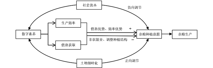 数字素养如何对农户杂粮种植产生影响? 根据新经济增长理论和农户行为理论,数字素养作为释放农业技术进步效果的驱动力,能提高农户信息获取能力、积累信息优势,推动农业生产方式的转变、提高生产效率,进而影响到农户杂粮生产意愿,且这一影响路径受到农户家庭社会资本和土地细碎化等资源禀赋的影响。具体逻辑如下: