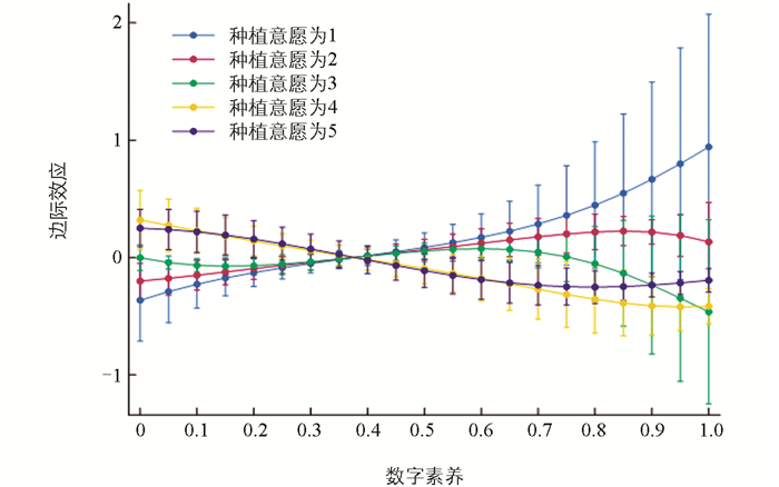 计算不同数字素养水平下的边际效应,绘制边际效应变化图(图 2)。根据图 2可以发现,低意愿类别(种植意愿为1,2)的边际效应呈现递增趋势,并由负转正;高意愿类别(种植意愿为4,5)的边际效应呈现递减趋势,并由正转负。这表明随着数字素养的提高,低种植意愿的概率先减少后增加,高种植意愿的概率先增加后减少。进一步计算拐点2.822/(2×3.742)≈0.377,其经济意义是当数字素养水平低于0.377时,数字素养水平提升会显著提高农户杂粮种植意愿;但当数字素养水平跨过0.377时,数字素养的提高会抑制农户杂粮种植意愿,两者呈现出倒“U”形关系。这与前述理论分析一致,在农户数字素养相对弱时,数字素养有效缓解了农业生产中的信息不对称问题,提升技术应用效率,优化农户生产配置行为;同时,信息化提高了农产品交易的匹配度,农户杂粮种植意愿得到激励。当农户具有一定数字素养时,数字技术引发的信息化打破农村劳动力市场的信息壁垒,农民借此获取更多就业机会,兼业与非农就业现象增加,直接降低了农户从事农业生产活动的意愿;农业劳动力的持续流出还会导致农业生产率下降,间接抑制农户杂粮种植意愿。假说(H1)得证。