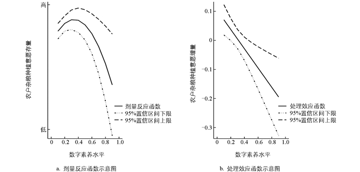 其中:T表示数字素养,S则表示广义倾向得分匹配值。使用logit估计结果变量“种植意愿”的条件期望。最后,将不同处理水平下的因果效应进行连接,得到数字素养与农户杂粮种植意愿的“剂量反应”函数关系,图 3a与图 3b分别显示了数字素养对农户杂粮种植意愿的剂量反应函数与处理效应函数曲线。由图 3可知,数字素养对农户杂粮种植意愿的边际效应递减,数字素养与农户杂粮种植意愿呈现倒“U”形关系,即在GPSM控制了相关内生性问题下,结论依旧稳健。