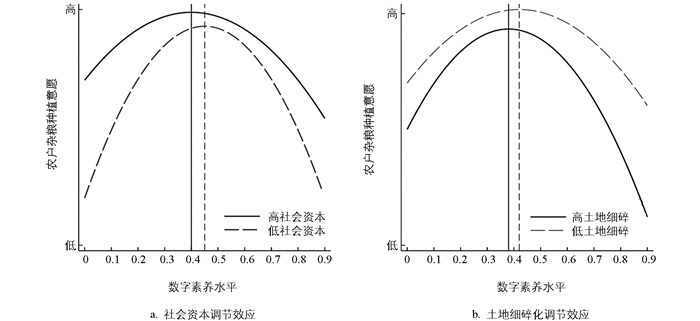 表 7结果显示,数字素养与社会资本交互项在1%的水平下显著为负(-11.958),数字素养二次项与社会资本的交互项在1%的水平下显著为正(15.171),且系数2.461×15.171-(-4.165)×(-11.958)=-12.469<0,表明社会资本对倒“U”形曲线起负向调节作用,推动曲线拐点向左移,曲线形态更加平缓,如图 4a所示,验证了假说(H4)。在农户数字素养相对薄弱时,随着社会资本的增加,通过社会网络讨论新信息,能更加高效地利用信息,优化生产要素配置,提高生产效率,推动倒“U”形曲线拐点左移。社会资本越强的农户本身生产效率和种植意愿更高,又会削弱数字素养对农户杂粮种植意愿的激励效应,使“U”形曲线左侧更加平缓。当农户具有一定数字素养后,数字素养的提升可以巩固和发展社会资本,助力农户与社会资本共享信息,对于不想留在农村的农户来说数字素养的提升会使农户兼业和非农就业概率增加。对于已在农业领域构建强社会网络的农户,因不愿意失去原有的社会关系优势,选择继续从事农业活动,数字素养对杂粮种植意愿的抑制作用减弱,倒“U”形曲线右侧更加平缓。