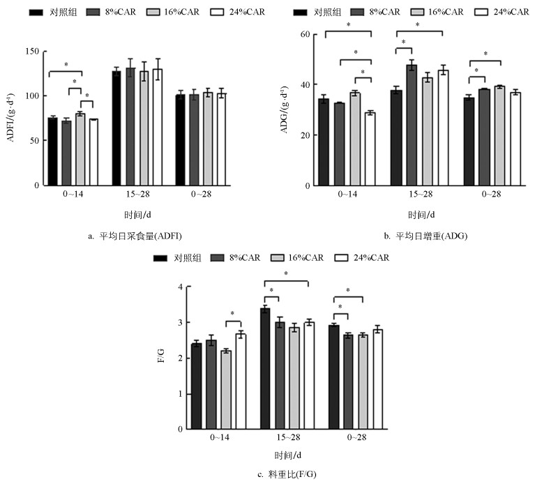 如图 1所示,16%CAR处理组0~14 d的ADFI显著高于对照组、8%CAR处理组和24%CAR处理组(p<0.05),但各处理组15~28 d和0~28 d的ADFI均未表现出显著性差异(p>0.05)。24%CAR处理组在0~14 d的ADG显著低于对照组、8%CAR组和16%CAR处理组(p<0.05);8%CAR处理组和24%CAR处理组在15~28 d的ADG显著高于对照组(p<0.05);8%CAR处理组和16%CAR处理组在0~28 d的ADG显著高于对照组(p<0.05)。就F/G而言,24%CAR处理组在0~14 d显著高于16%CAR处理组(p<0.05);8%CAR处理组在15~28 d与0~28 d,16%CAR处理组在0~28 d,24%CAR处理组在15~28 d均显著低于对照组(p<0.05)。