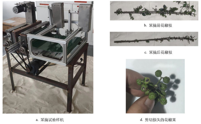 为解决上述问题,本文结合“下桩”采摘技术,基于往复式切割原理,研制一种分层剪切式青花椒采摘装置,为花椒采收及机械化喂入提供新的方案。通过对分层剪切脱果、带齿联合输运、双齿啮合拉拽等关键部件进行参数设计、运动学和动力学分析,确定影响青花椒采摘的工作参数; 通过单因素试验确定工作参数范围,结合正交试验,探究工作参数与评价指标的互作关系,得到最优工作参数,可为青花椒高效低损采摘设备的研发提供参考。