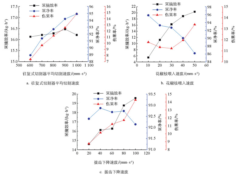 花椒枝喂入速度对评价指标的影响如图 11b所示。在花椒枝喂入速度增大的同时,采摘效率逐渐增大,采净率逐渐减小,伤果率先减小后增大。当花椒枝喂入速度在10~30 mm/s时,花椒枝经过往复式切割器的时间变短,花椒果被剪切的可能性减小,伤果率减小; 当花椒枝喂入速度大于30 mm/s时,花椒枝的侧枝及花椒果未被剪切且花椒枝继续向前输运,花椒果通过往复式切割器时被挤压,采净率减小,伤果率增大。为获得较高的采摘效率,并保证较小的伤果率,选取花椒枝喂入速度为20~40 mm/s。