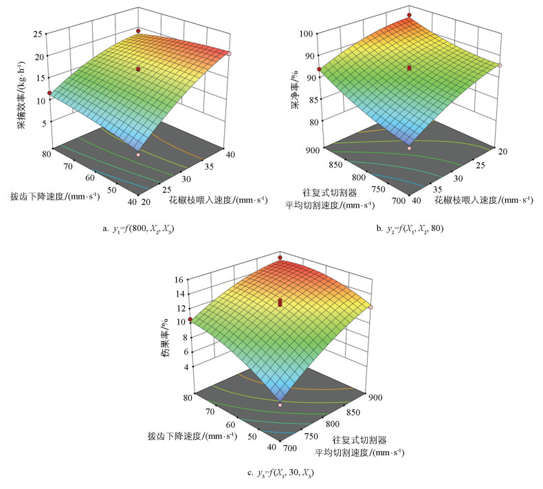 由表 6可知,往复式切割器平均切割速度X1和拨齿下降速度X3的交互项对伤果率呈显著性。如图 12c所示,当花椒枝喂入速度和拨齿下降速度作为固定因子时,伤果率随往复式切割器平均切割速度的增加而不断增大,由于单位时间内花椒枝被剪切的次数变多,伤果率增大。当往复式切割器平均切割速度和花椒枝喂入速度作为固定因子时,伤果率随拨齿下降速度的增加而不断增大,由于拨齿快速下降与花椒果碰撞,撞击力增大,伤果率增大。