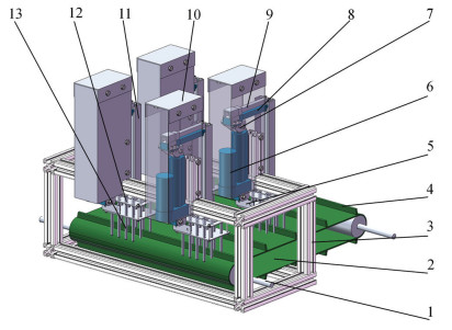 分层剪切式青花椒采摘装置的工作流程包括人工上料、枝条输运、枝条脱果和枝条拉拽4个工序。将“下桩”后的花椒枝通过人工上料放至放料装置; 均布在传送带上的柔性拨板将花椒枝由放料装置拨至传送带进行输运,在带齿联合输运装置的夹持作用下输运至分层剪切脱果装置,实现花椒枝的喂入; 分层剪切脱果装置切断花椒枝上的果柄及侧枝,实现花椒枝脱果; 切下来的物料(即花椒果、侧枝等)掉入落料口,脱果后的花椒枝通过双齿啮合拉拽装置拉拽至分层剪切式青花椒采摘装置的后方。