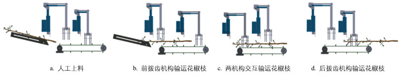 花椒枝稳定输运至切割区是后续高效脱果的核心工序和难点。本文中带齿联合输运装置的工作流程如图 4所示,具体流程为:①人工将花椒枝放至放料装置,花椒枝被传送带输运向拨齿区,如图 4a所示。②花椒枝输运至拨齿区,前拨齿机构中的推杆电机Ⅰ下降,拨齿由花椒枝的上侧约束其可能存在的移动,推杆电机Ⅱ伸出实现花椒枝同向输运; 同时后拨齿机构中的推杆电机Ⅰ上升,推杆电机Ⅱ收回,为下一次输运作业做准备,如图 4b所示。③前拨齿机构将花椒枝完全输运至传送带上,单次输运作业完成,同时推杆电机Ⅰ上升,后拨齿机构开始下一次输运作业,如图 4c所示。④花椒枝前段进入切割区进行脱果,后拨齿机构持续输运作业,直至花椒枝尾部端脱离拨齿区,如图 4d所示。