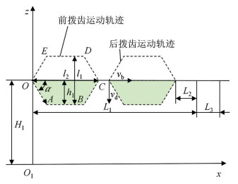 拨齿的运动通过2组推杆电机相互协同的伸缩运动来实现。为分析拨齿机构输运作业的条件及确定拨齿机构的参数,将拨齿的运动过程分解并建立坐标系。坐标系原点为前拨齿机构(以其中1组为例)的拨齿最下端上任一点(运动起始位置点O)在机架上的投影点O1,花椒枝的输运方向为x轴,竖直方向为z轴,如图 5所示。
