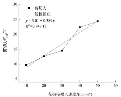 根据参考文献[5, 16]及预试验,将往复式切割器平均切割速度设置为800 mm/s,花椒枝喂入速度设置为10~50 mm/s,以10 mm/s间隔递增,完成5次试验。