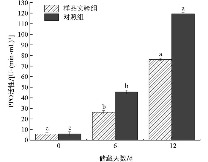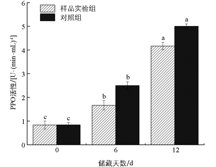 • 莲藕鲜切后由于机械损伤的存在,在储藏过程中较未鲜切的更易发生褐变,PPO和POD是褐变反应中的主要酶类[20]。PPO通常是引起果实褐变的一种重要酶类,不但影响果实口味还影响美观[21]。PPO是植物体内重要的呼吸酶类,其活性与果实的衰老程度相关[22]。在储藏期间,PPO活性逐渐升高,这可能是由于果实酶促反应其主要作用的酶是游离态多酚氧化酶(FPPO),切割破坏了细胞的膜结构,使得结合态多酚氧化酶(BPPO)从膜上游离成FPPO,与底物结合使其氧化,从而使PPO活性增高[23]。由图 1图 2可知,在储藏初期,样品实验组和对照组的PPO活性和POD活性的差异无统计学意义。随储藏天数增加,样品实验组的PPO和POD活性比对照组更低。研究发现抗坏血酸对薄荷PPO活性[24]和洋蓟PPO活性[25]也有明显的抑制作用,随后的研究证实了抗坏血酸对PPO活性具有竞争性抑制作用[26-27]