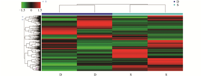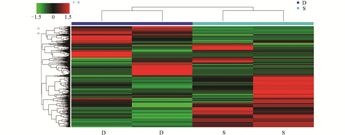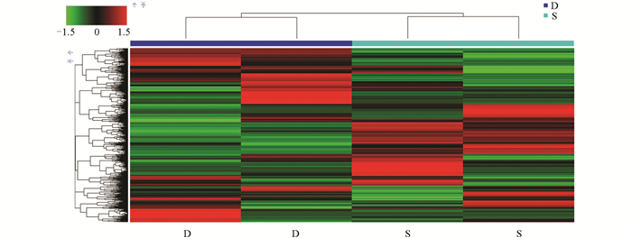 PCA结果显示,在0 d的样品实验组(S)和对照组(D)中,PC1、PC2的贡献率分别为46.0%,28.5%;在6 d的样品实验组(S)和对照组(D)中,PC1、PC2的贡献率分别为37.9%,34.1%;在12 d的样品实验组(S)和对照组(D)中,PC1、PC2的贡献率分别为51.2%,25.8%。结果显示,组间差异主要在第一主成分(PC1),组内差异主要在第二主成分(PC2),整体上看,组内差异远小于组间差异。每个样本在图上呈现出明显的分离趋势,提示每组中包含的代谢物表达量差异较大。为进一步研究代谢物差异情况,应结合差异代谢物筛选结果和聚类分析进行分析。
