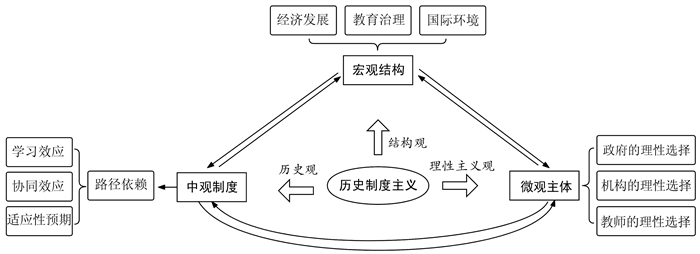 选用历史制度主义来分析新加坡教师教育政策的变迁具有极强的适切性:一方面,将政策发展过程中的关键时间节点与历史事件相连接,可以帮助研究者清晰地梳理政策变迁的脉络;另一方面,通过宏观、中观和微观3个层面综合分析新加坡教师教育政策变迁背后的制度逻辑,可以揭示政策存续以及转化的影响因素,更全面地呈现新加坡教师教育政策变迁的运行机理。本研究在构建分析框架时借鉴了周光礼和吴越的三维结构分析范式,从理性主义观、结构观和历史观出发,将理性主义中的行动者、结构主义中的深层结构以及制度本身结合起来[2],构建了“宏观结构—中观制度—微观主体”的分析框架(如图 1)。其中,宏观结构体现制度基础对政策的制约条件;中观制度聚焦制度演进中呈现的路径依赖特征;微观主体则关注在政策变迁中具体行动者的战略选择。需要说明的是,微观主体并不局限于个体行为者,也包括在具体治理体系中直接影响政策制定与执行的政府、机构等多元行为主体。本研究将其统一纳入行动者维度,以便更好地呈现不同类型主体之间的互动逻辑。